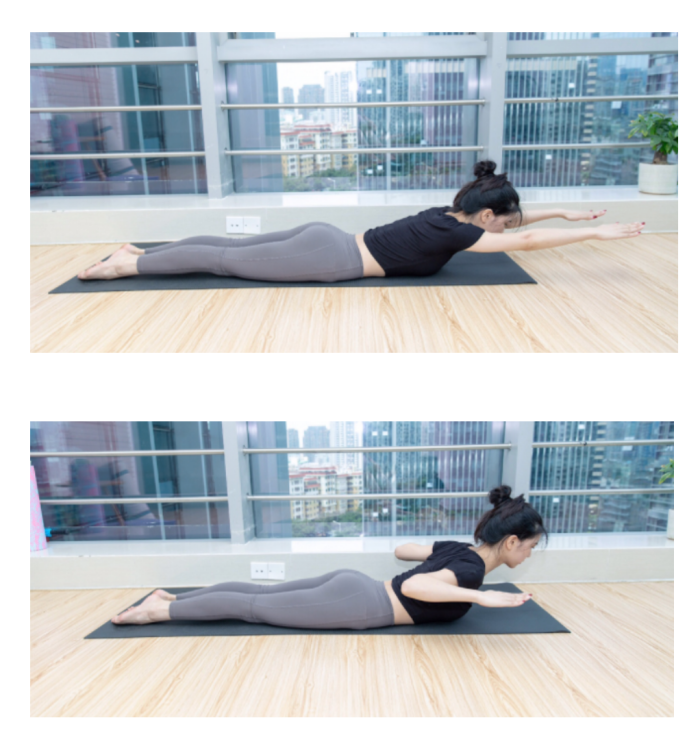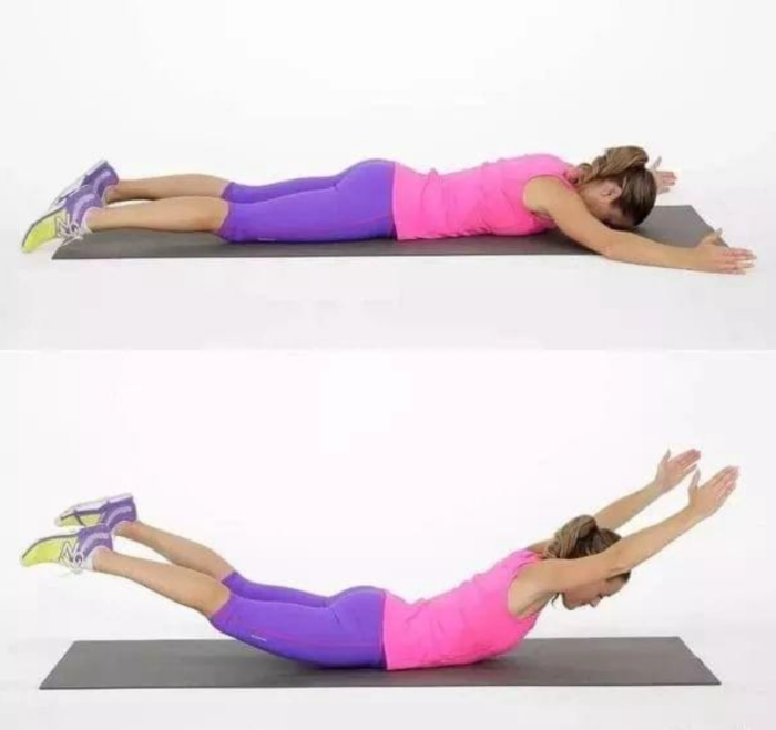 首先全身趴在地上,然后手臂向后,腿伸直升高,记得手脚要高过肩膀,然后维持在你能维持的最高点30秒,这个动作可以雕塑背部线条和改良姿势。