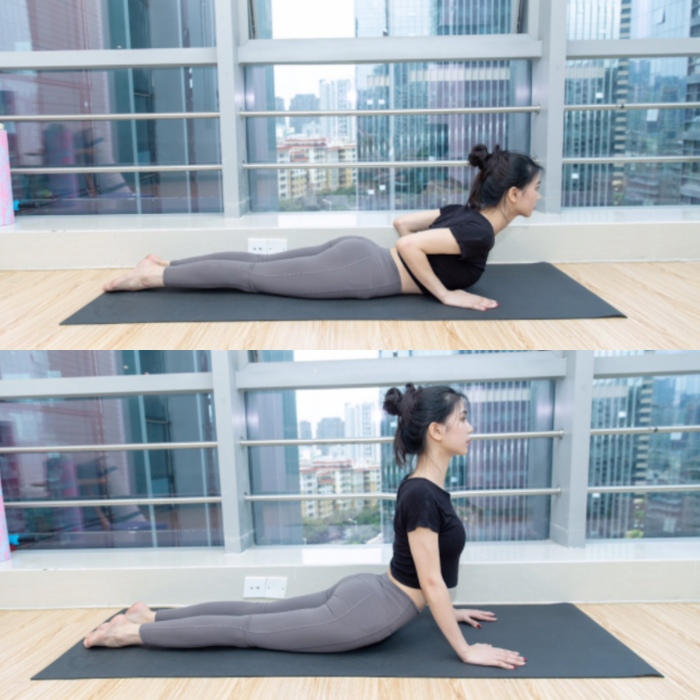 趴在地面上,然后双脚伸直,双手放在胸部两侧的位置,手部撑起的时候吸气,上半身撑到自己最大幅度,停留5-10秒,完成后慢慢回到开始的动作。