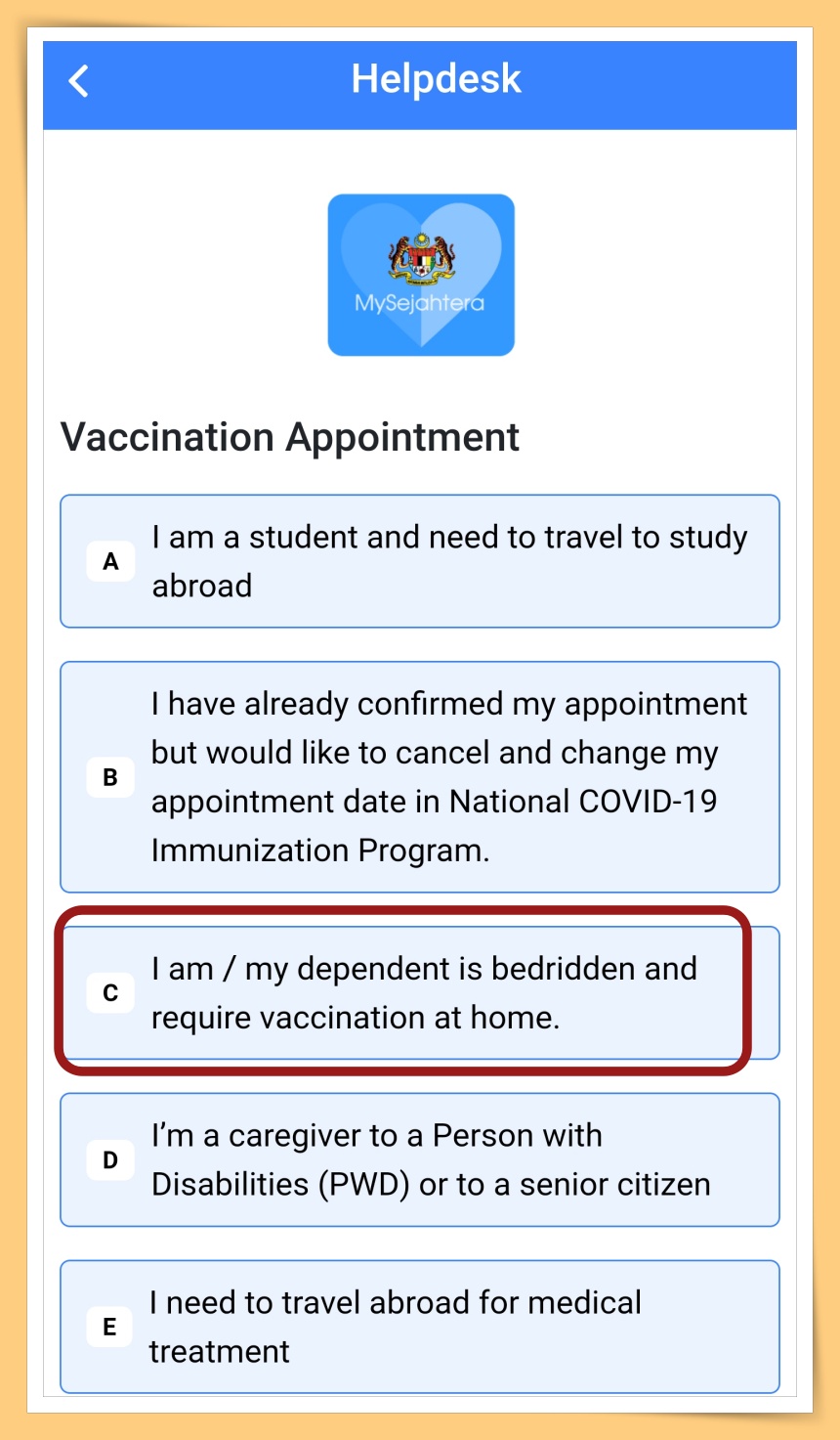 ✅ 接着点击C:I am/my dependent is bedridden and require vaccination at home