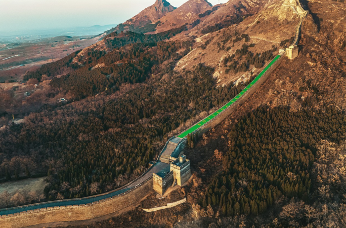 该装置就设在山海关角山长城,是明长城最东边的关,因此还有了「天下第一关」的别称,数公里长的电子屏幕亮出了「新春快乐」四字,简单明了向全世界表达祝贺。