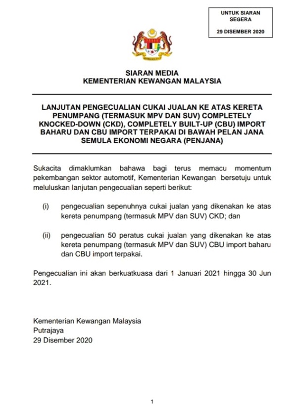 如果你来不及在今年换新车,那现在有一项好消息!因为汽车销售税回扣的优惠将延长6个月至2021年的6月!财政部长发文告指出,这是为了推动汽车行业发展,所以批准了延长的措施。本地组装(CKD)的汽车仍然可以获得100%销售税豁免,而进口装的(CBU)汽车则可以享有销售税50%。