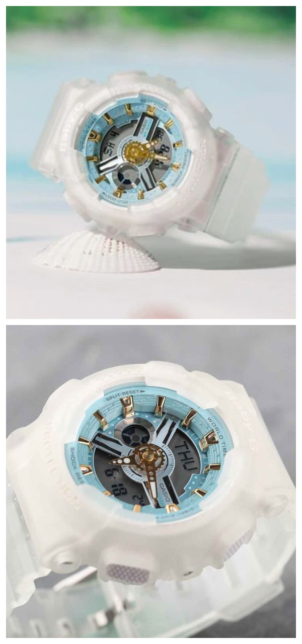 平日穿得贵气的泫雅,其实也不止一次佩戴Casio手表,复古表一直都是她的最爱。这次戴上的Casio Baby-G表款型号原来是BA-110SC-7A的「梦幻海玻璃款」。以海玻璃为灵感,透过白色磨砂质感的半透明腕表,搭配水蓝的表盘和金色时针时标点缀,加上清新的配色,真的美得很有层次啊~完全就是女生们难以拒绝的梦幻样式。
