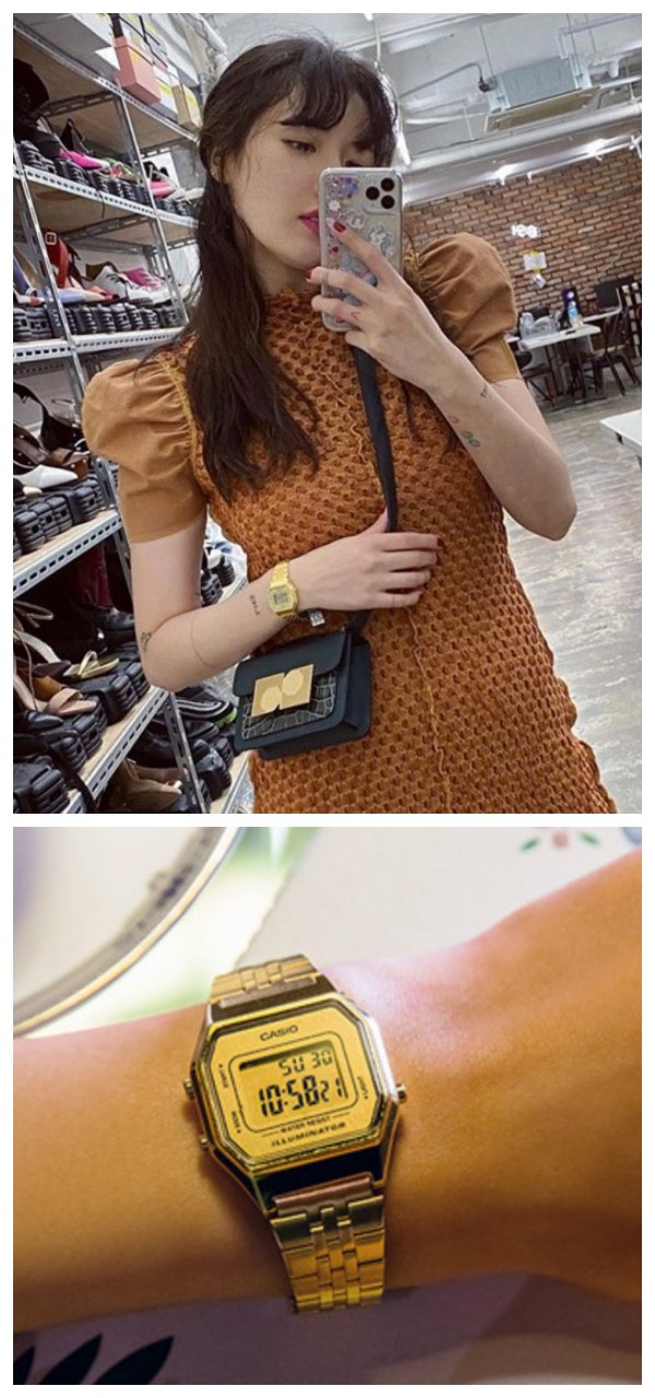 泫雅也曾带过的Casio LA680WGA-9金色数字型电子表款。