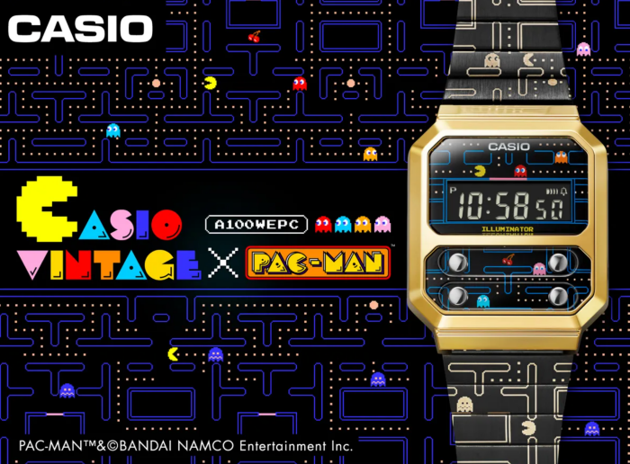 Casio真的是个机灵鬼,这次直接把PAC-MAN搬进手表中,并复刻了Casio经典表款「F-100」,推出了这款联乘复古手表「A100WEPC」,可惜仍未知道上架日期和价格。