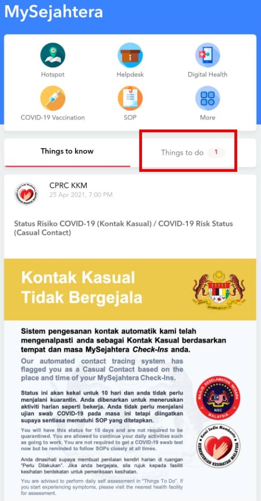 在MySejahtera App上收到Casual Contact后,你该这样做!
