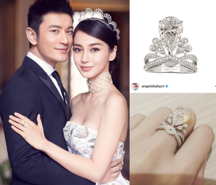 虽然总是传出婚变的Angelababy和黄晓明,但他们的世纪婚礼还是历历在目啊~AB的婚戒也是不容小觑,来自Chaumet的梨形钻戒,有5.53克拉,而且超华丽如皇冠的设计真的是闪瞎大家~