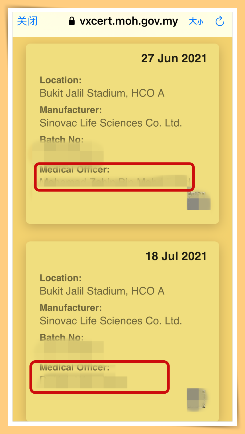 ✅ 步骤4: 接着就会出现你的接种疫苗资料,包括个人身份证号码、接种疫苗种类、接种疫苗Batch和为你接种疫苗的医护人员名字。