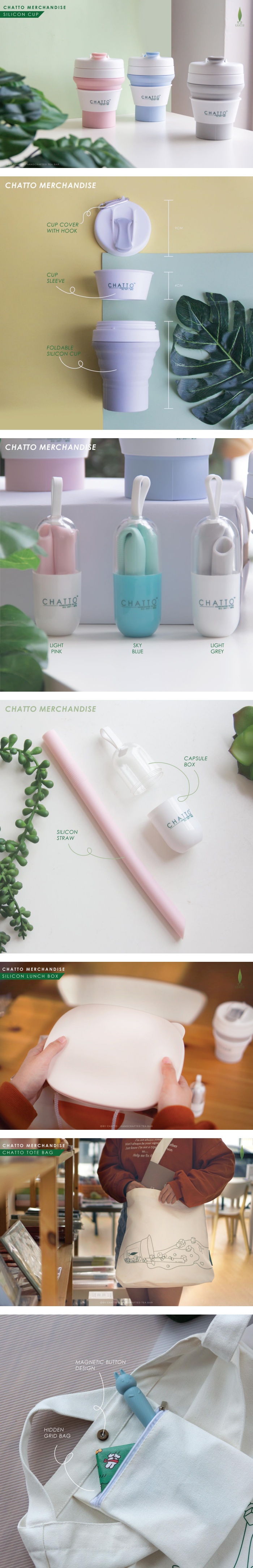 向来注重大家健康以及环保路线的 Chatto,这次为呼吁大家一起爱护环境,打造推出了一系列可重复使用硅胶材质餐具,当中包括了杯子、习惯、环保袋以及便当餐盒等等作为周边产品,旨在鼓励大家一起减少使用塑料品和垃圾的制造。
