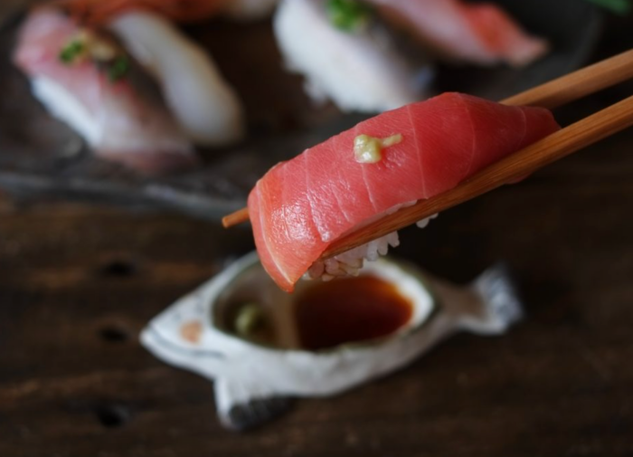 很多人习惯就会将饭团那一面沾酱油,其实正确的方法是用鱼肉的部分或是紫菜的侧面去沾酱,或是直接用小酱油瓶在寿司上点几滴就可以了。