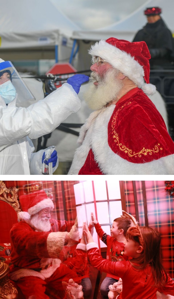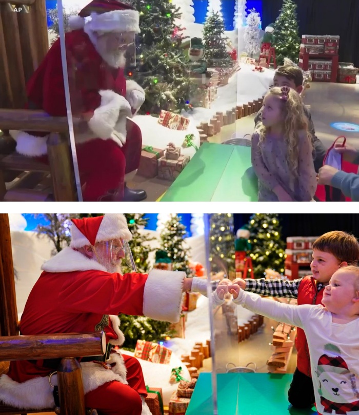 美国疫情严重,为了确保大家的安全,圣诞老人们都必须带上透明面罩,隔着胶板和大家见面!