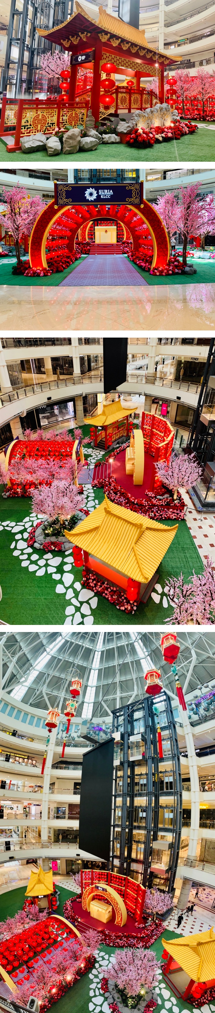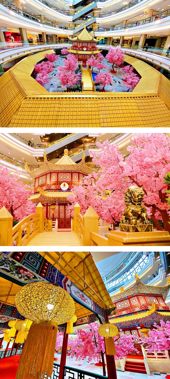 近期的FB都被 1 Utama 的新春装饰刷版了吧!商场几乎就是想带着前来的宾客一起穿越时光回到古时代吧!商场中央位置摆设了满满的桃花,搭配金碧辉煌的梁桥和宫廷设计,真的有让人置身在古代的感觉啊!
