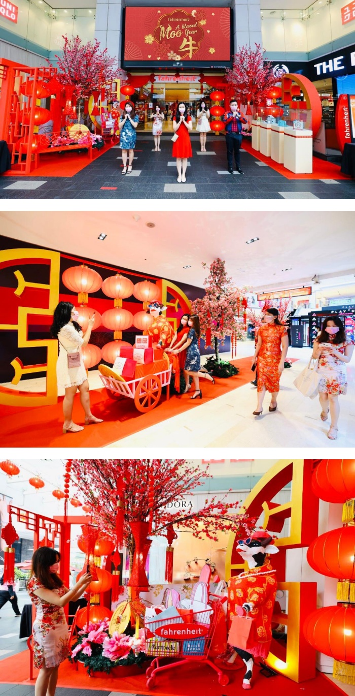 Fahrenheit88 的大门口一直到大厅位置都设有新春装饰,最有趣的是,商场将符合今年春节主题的牛牛生肖,换上红色旗袍和时尚的墨镜,手推着购物车,宛如在商场中购物的其中一名宾客,让人看了忍不住会心一笑。