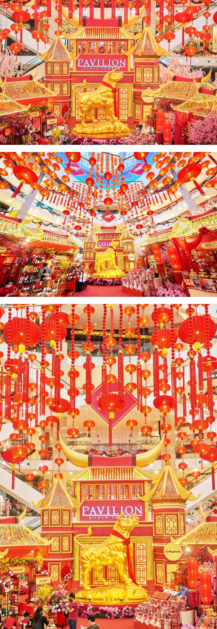 Pavilion KL 每个大节日的装饰都不会让人失望!今年新春,更是将高达25英尺的金牛搬入商场中央位置,加上高挂的红灯笼和充满古风气息的建筑背景,让整体看起来非常有气势啊!