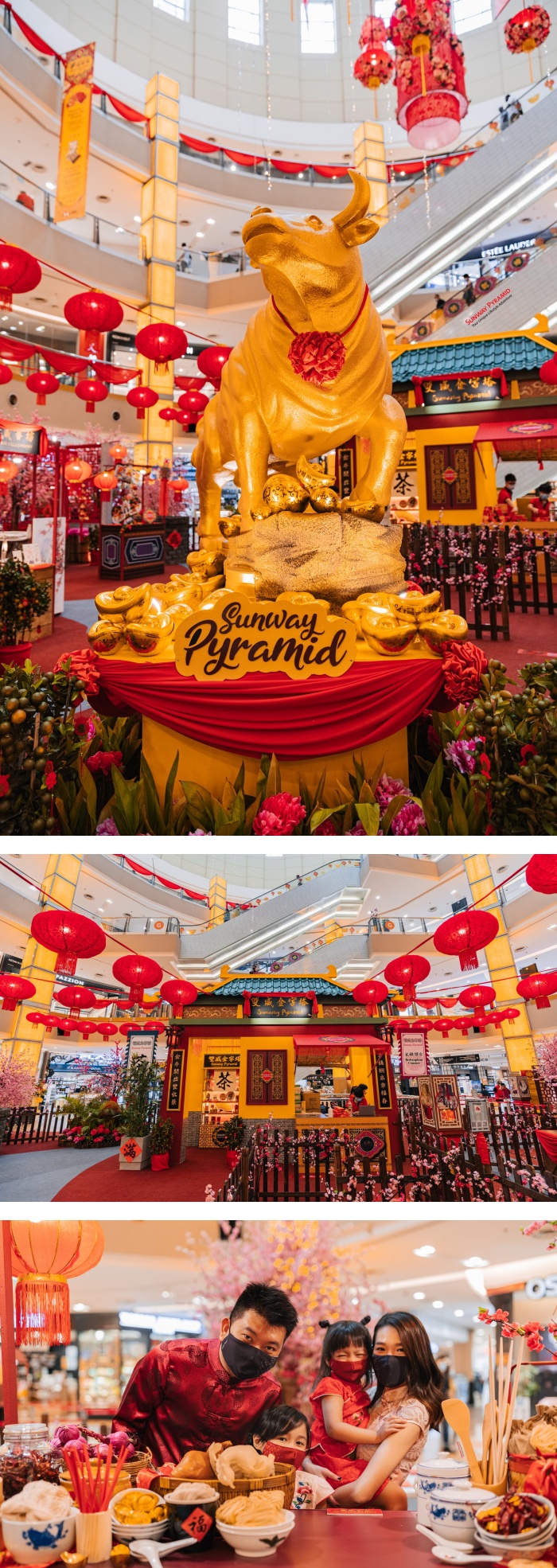 Sunway Pyramid 今年也是用尽了心思啊!宾客来到底层二楼 Orange Concourse 位置就可以看见金光闪闪的古城,周围还有象征吉祥如意的桔子树以及红灯笼作为点缀,在中央大厅位置还设有一只大金牛,为整个商场增添不少喜气洋洋的气息啊!