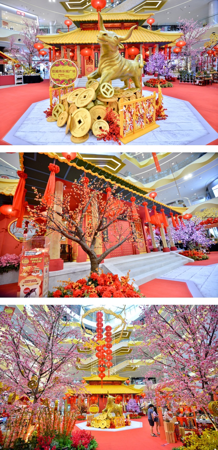 一进入 Sunway Velocity 的大厅,你就可以看到倒吊高挂着的大串金币,前方不远处还有一只金牛在等候着大家,宛如正在欢迎宾客的到来。此外,金牛的深受还有一座充满古风的建筑,四周围绕着粉色的桃花树以及红灯笼的细节点缀,整体弥漫了愉悦喜庆的氛围。