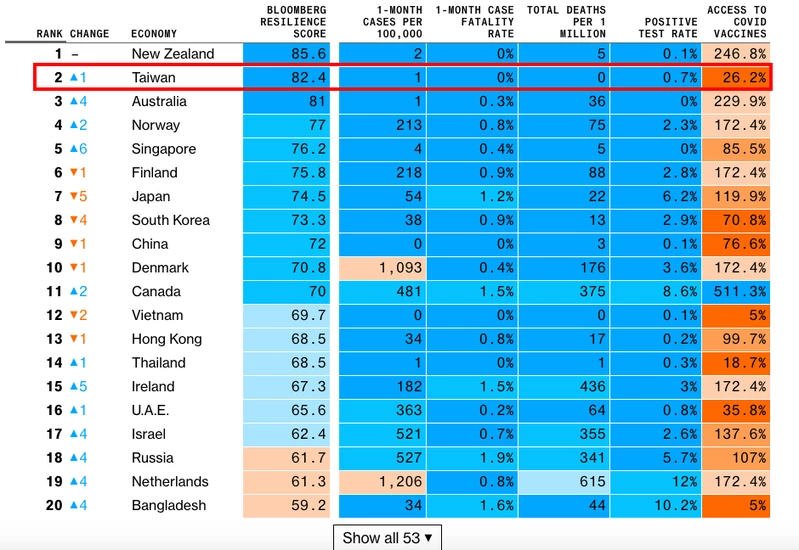 新冠肺炎全球大爆发,几乎没有所谓的"新冠零风险"国家或地区,彭博资讯整出一份“抗疫韧性排行榜”,列出全球最安全和最不安全的地方,今次台湾屈居第二超越日本,仅次于纽西兰成为亚洲之冠!