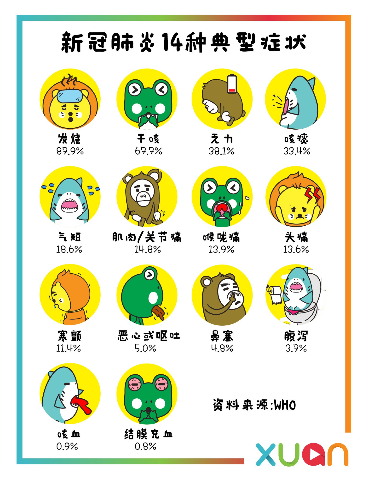 让我们重新再看看世界卫生组织所整理出的新冠的症状:
