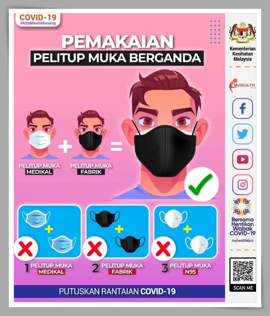 ✅ 先戴一层医用口罩,过后在戴上布制口罩,✅ 如果佩戴N95口罩,只需佩戴一个即可。
