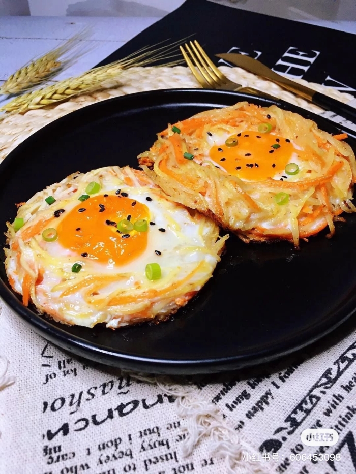 -在凹处打入鸡蛋,小火慢慢煎至鸡蛋凝固,萝卜和土豆丝熟了就可以出锅
