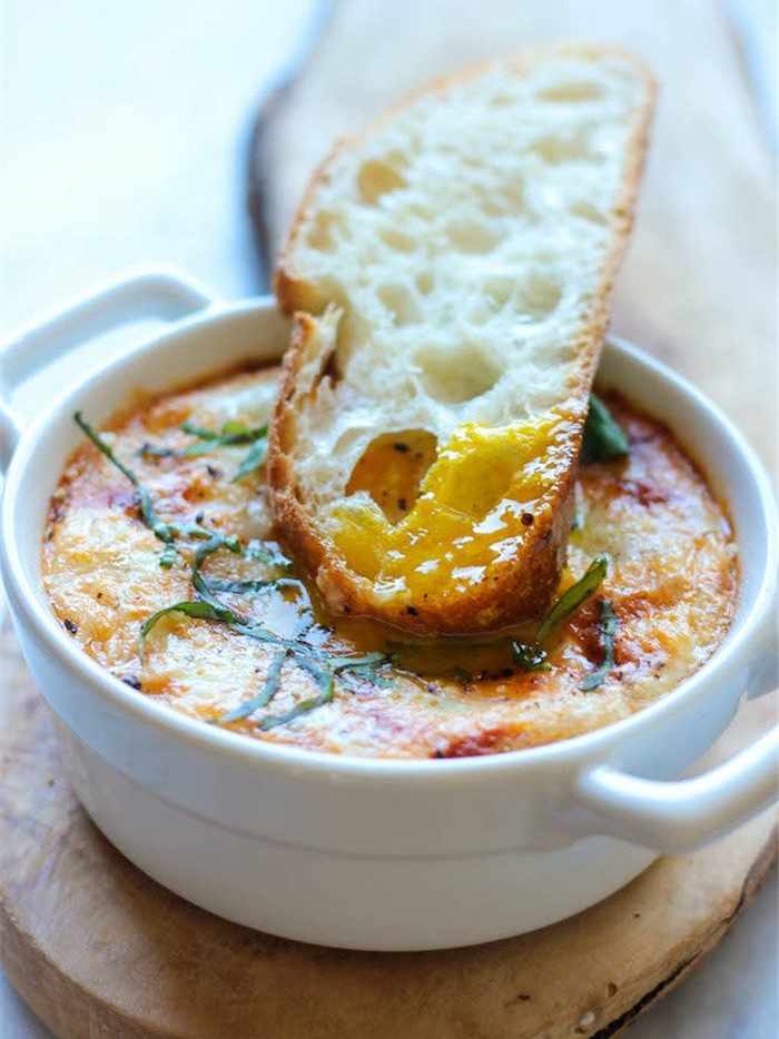 1 杯番茄意粉酱、4 个鸡蛋、1/4 杯脱脂鲜奶、1/4 杯芝士碎、2 tbsp 磨碎的 Parmesan 芝士、盐适量、黑胡椒适量、1/4 杯新鲜罗勒叶切丝