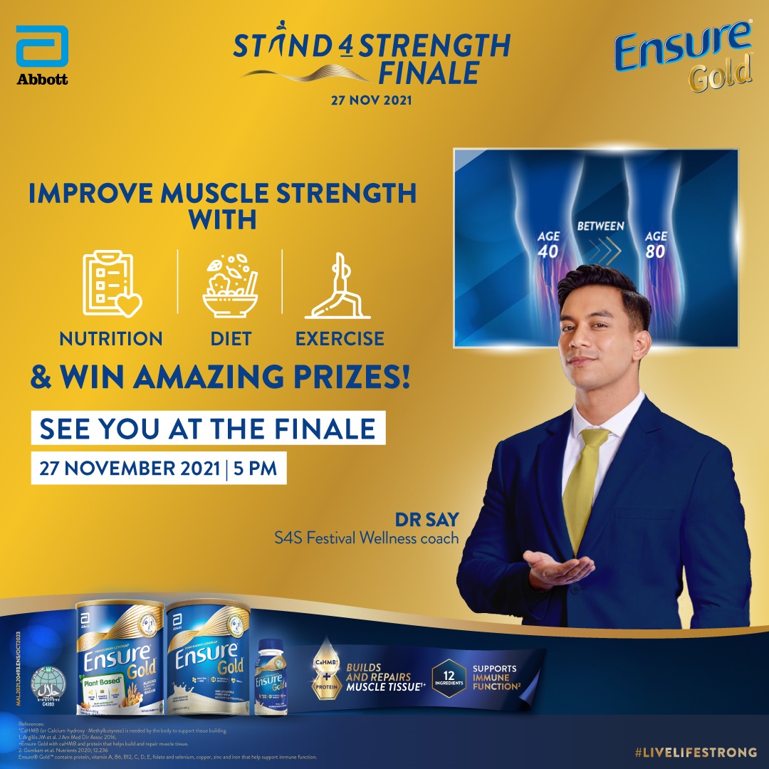 为了让你进一步了解增加肌肉的重要性,Ensure® Gold™ 於10月30日至11月27推出了Stand4Strength Festival,连续4 周让专业人士和你分享如何透过适当的锻炼、营养均衡与饮食,来管理与增加肌肉的力量。