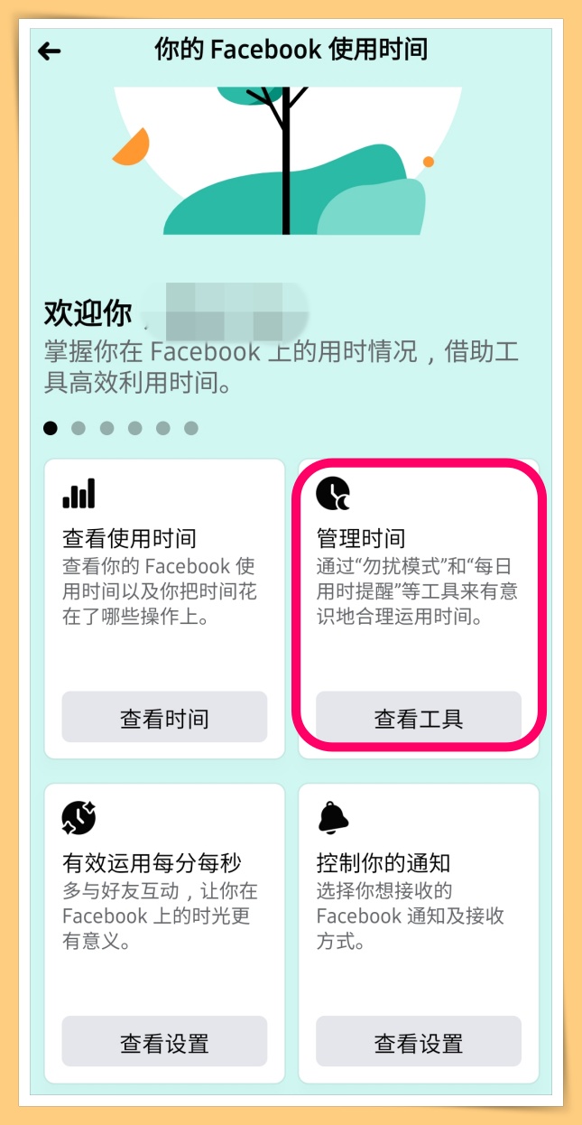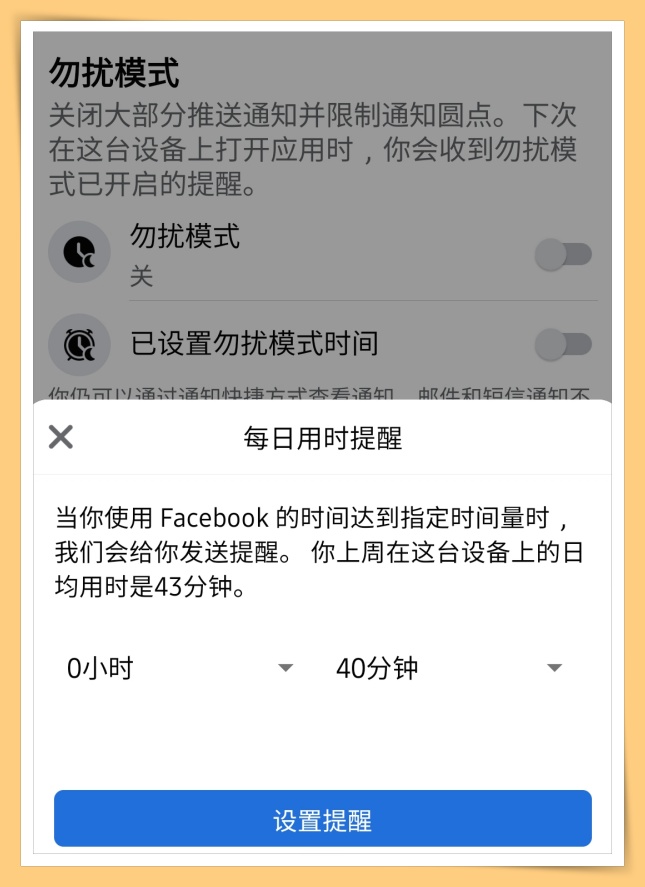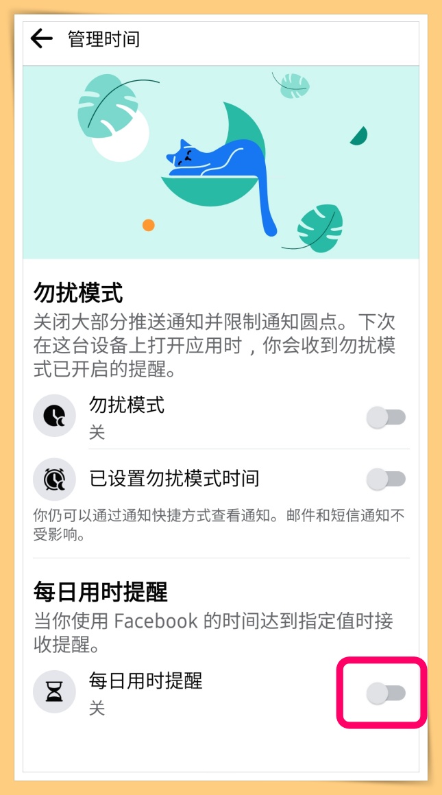 如果你经常刷FB忘了睡觉或吃饭,FB里有个“管理时间”的功能,只需开启“每日用时提醒”,当你使用Facebook的时间达到指定时间量时,将会收到提醒哦!