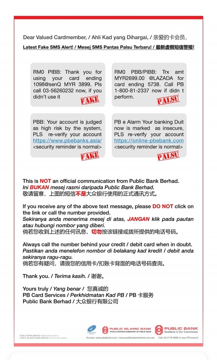 诈骗SMS层出不穷,不是让你call回去就是让你点击链接。近日,大众银行 不断出现用户被盗刷和存款骗走的案例。于是在官网公开了4个虚假短信,呼吁用户们别再上当了!!