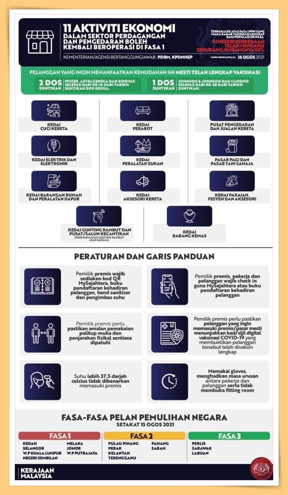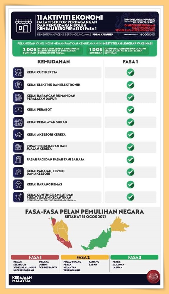 我国首相丹斯里慕尤丁发文告宣布,目前处于国家复苏计划第一阶段的州属,有11个经济领域可以从8月16日起恢复营业。