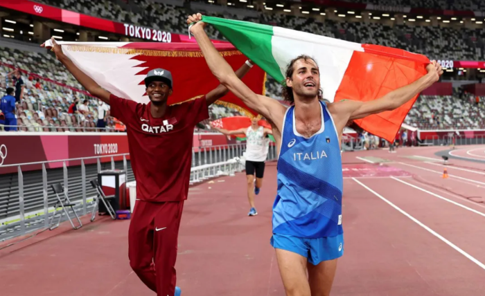 奥运真的是个让人刺激又感动的运动赛事,日前跳高比赛上,来自卡达的跳高选手Mutaz Essa Barshim和意大利选手Gianmarco Tamberi,经历了3次的高度挑战,均获得了相同的成绩,在裁判询问加赛意愿的时候,Barshim问了一句「可以有两面金牌吗?」最后共同决定共享这份荣耀!