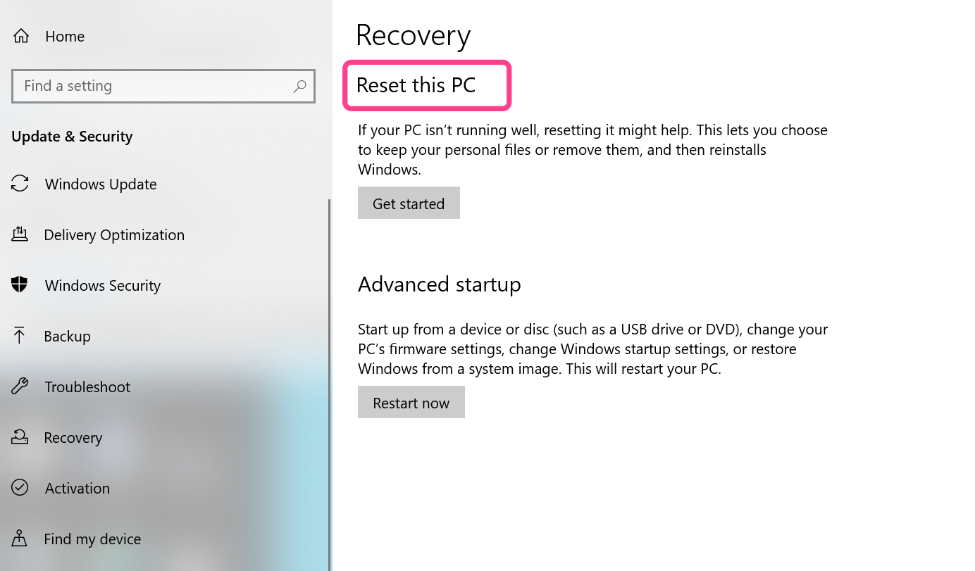4.右边就会出现两个选项,选择Reset This PC,点击Get Started