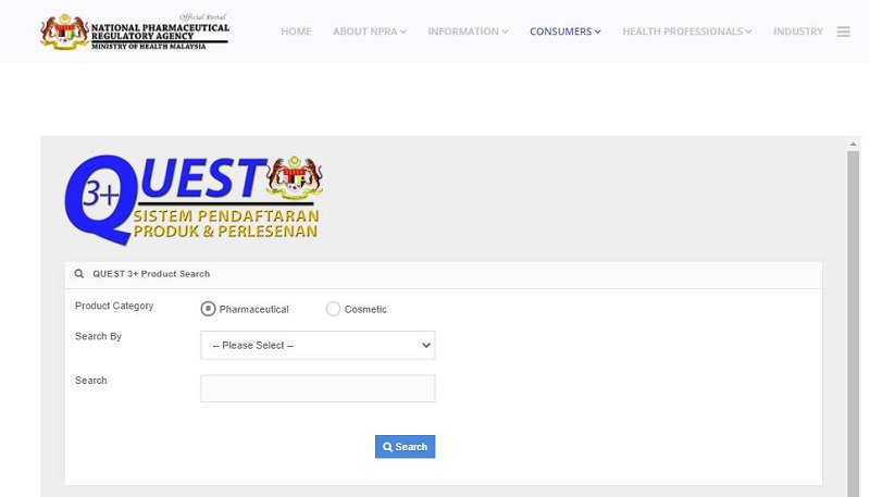 选择“Comestic”,然后透过产品名称注册号码和制造商查询产品详情。