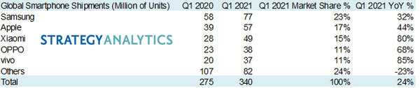 全球著名信息机构Strategy Analytics发布了2021年第一季度全球智能手机出货量排行榜,结果Q1总出货量为3.4亿台,同比增长24%。这次的榜单冠军是Samsung!
