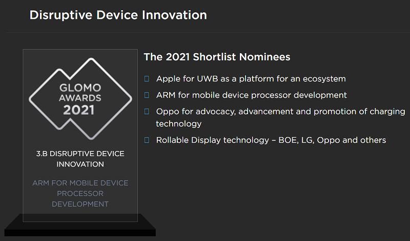 ARM赢得移动设备处理器开发的颠覆性设备创新奖。