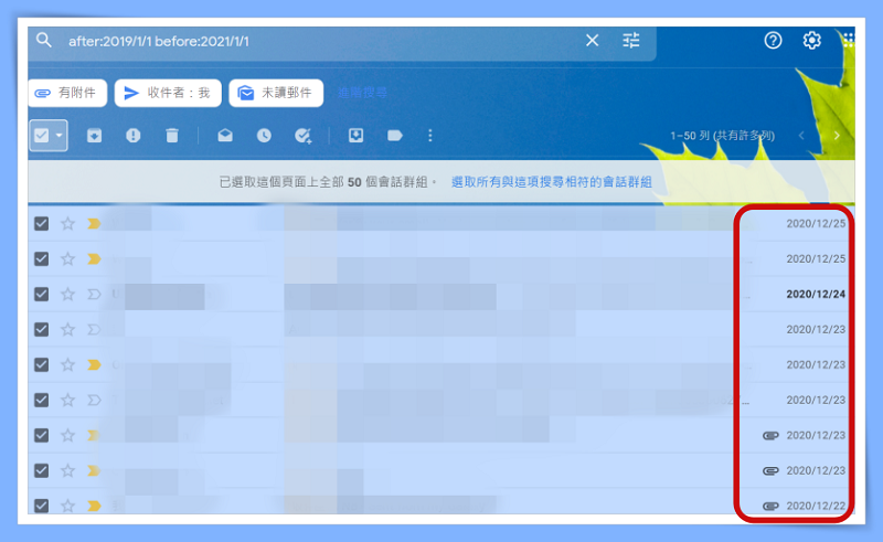 ? 步骤1:首先在Gmail页面上方搜索栏里打上:after2019/1/1 before:2021/1/1 这样系统就会整理出从2019年开始至2021年1月1日前的所有邮件。(如果要删除2017年的邮件,那就打上after2017/1/1)。