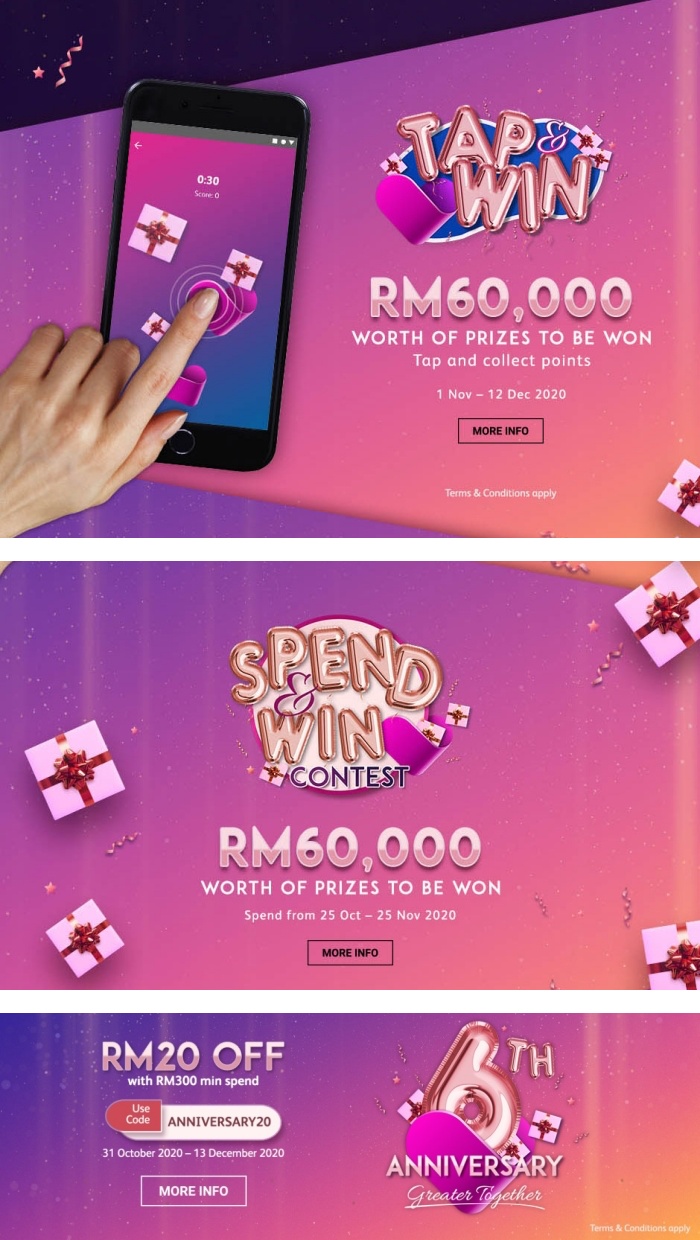 Go Shop 6周年庆促销活动将在即日起至12月31日期间举办,消费者每周都可享受得到高达 60% 的独家超值优惠以及低于 RM60 的商品。此外,Go Shop 也将会为消费者送出价值 RM60 万的优惠卷,凡消费满 RM300 的消费者可输入促销代码「ANNIVERSARY20」即可获取 RM20 的即时回扣!