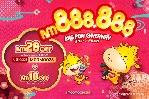 从即日起到2月15这段期间,只要透过Go Shop的《元气满满Moo Moo哒》新春活动期间,消费额最高并累积3次订单的38位客户,就有机会透过「Fortune Moo Moo」竞赛活动赢取总值RM23,888的丰富奖品。另外,即日起到1月31日,凡消费满RM300,可以使用优惠码「MOOMOO28」购买Go Shop在「RM888,888 Ang Pow Giveaway」活动中所展示的产品中获享RM28的即时折扣。