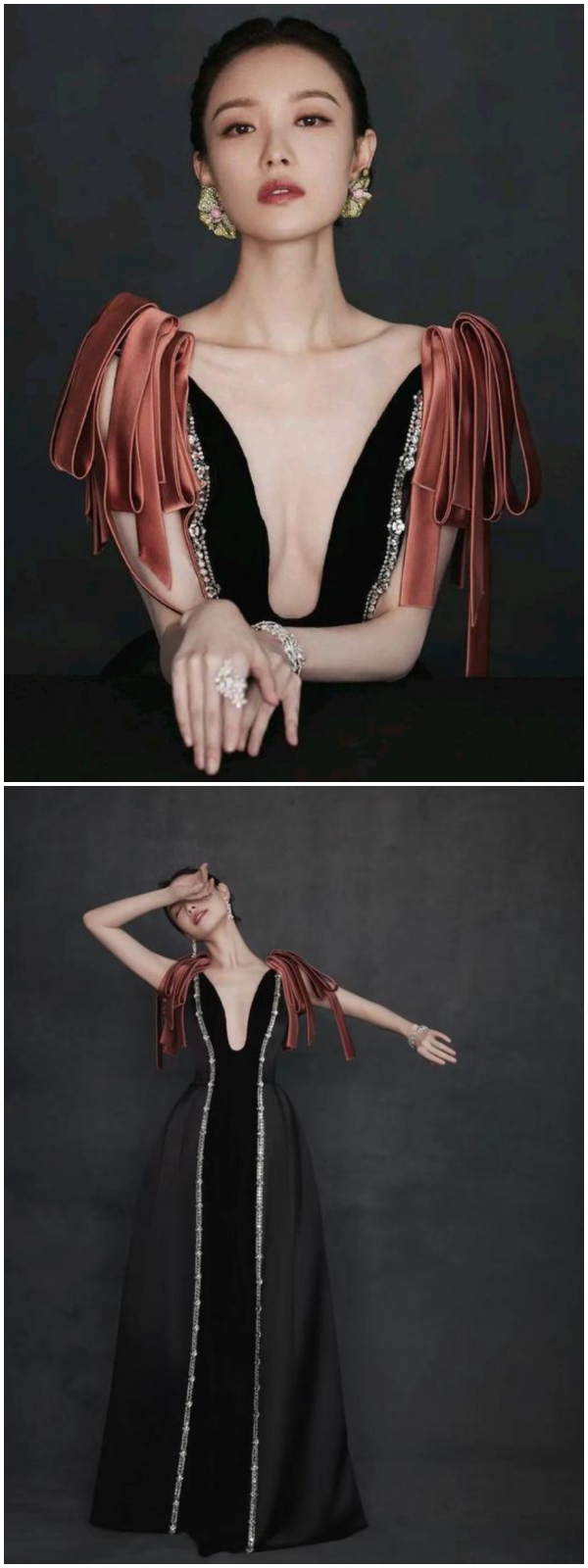 刘诗诗选择了一字肩的印花长裙,久违的红唇后和烟熏妆,都有点忘了刘诗诗还有冷艳性感的一面,礼服来自Chanel。