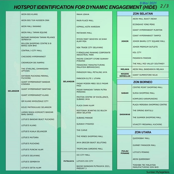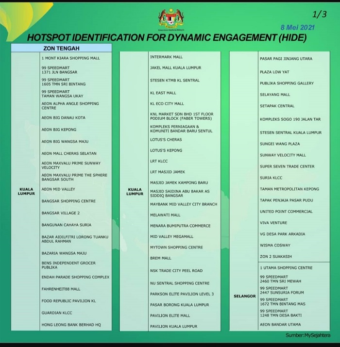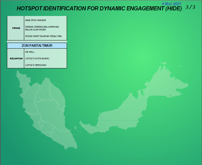 这个动态热点识别(HIDE)是利用MySejahtera应用程式签入数据和健康数据库,来识别和预测可能成为潜在疫情风险和出现潜在感染群的场所位置。