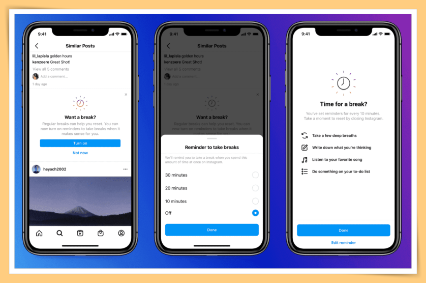 Instagram官方发消息指,将在应用程式上对青少年推荐的内容採取更严格的审核,若用户长时间关注同一个主题,Instagram也推出“休息一下”(Take a Break)功能,呼吁用户是时候休息了。