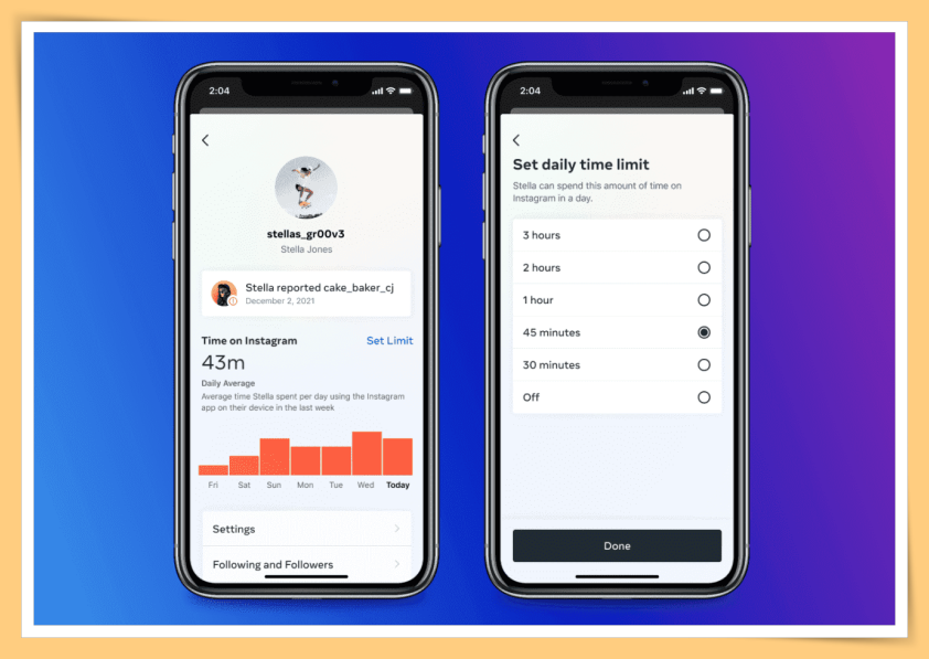 监护人可以查看孩子在IG上花了多少时间浏览,并且可以设定时间限制,以及当孩子在IG上举报一些内容或帐号时,家长都会收到通知。