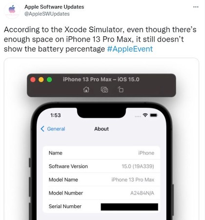 根据外媒在Twitter发文指出,即使iPhone 13 Pro Max萤幕上已有足够空间,但仍不会在状态栏上显示电量百分比,如果户若想查看电量需要将萤幕的右上角往下滑动。