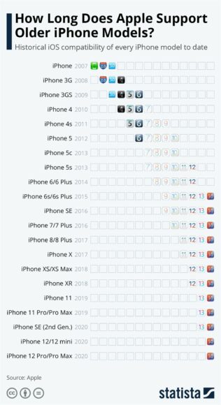 线上统计网站 Statista 上个月公布了一份 iOS 支援年限的统计表,其统计了 iOS 自 2007 年发表至今针对 iPhone 提供的支援,总结 Apple 已对 iPhone 4s、iPhone 5、iPhone 6/6 Plus、iPhone 7/7 Plus 等型号提供长达6年的支援。系统支援升级为电话能否继续使用下去的要点,因此就此角度而言,iPhone 的最长寿命严格来说可长达 6 年。