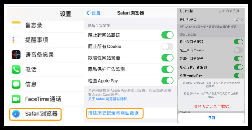 设置 》 Safari浏览器 》 清除浏览纪录和网站资料