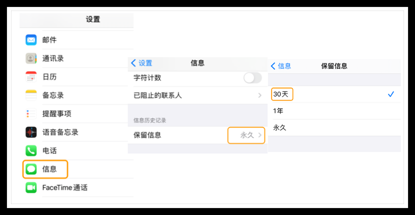 经常会收到一些讯息,果粉可以进入设定把默认的“永久”改为“ 30 天”,那么不重要的讯息就会自动清理掉。