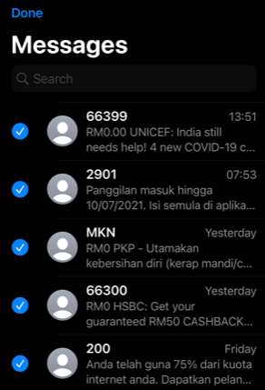 经常都会收到很多来自银行或其他人的短信,但要一个个删除很麻烦也耗时。其实,只要两指划下来就可以多选删除。