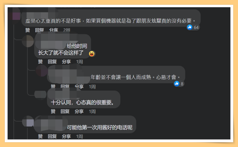 其实,自己用的手机和身边人有何关系?对于为了获得旁人的欣赏而换一部价值6千多的手机,他本身承认是“虚荣心”作怪。