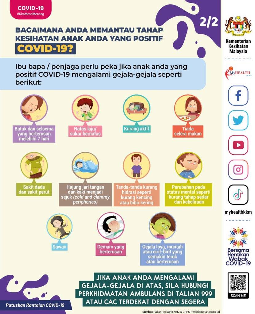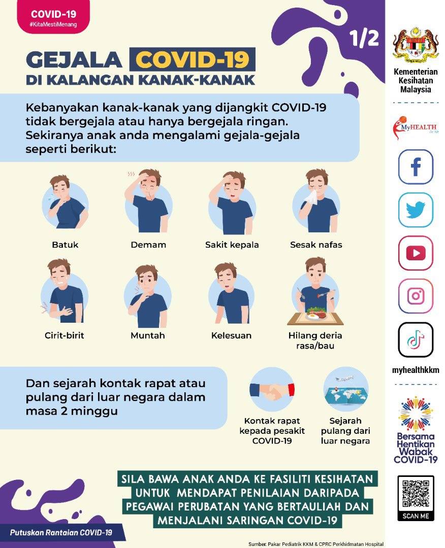 根据卫生部长之前所发布的数据显示,从去年爆发疫情以来至5月30日期间,我国已经有高达8万2341名孩童和青少年感染冠病,于是卫生部在官方脸书专页上发帖提醒民众,一旦儿童染上新冠肺炎将会出现各种症状。