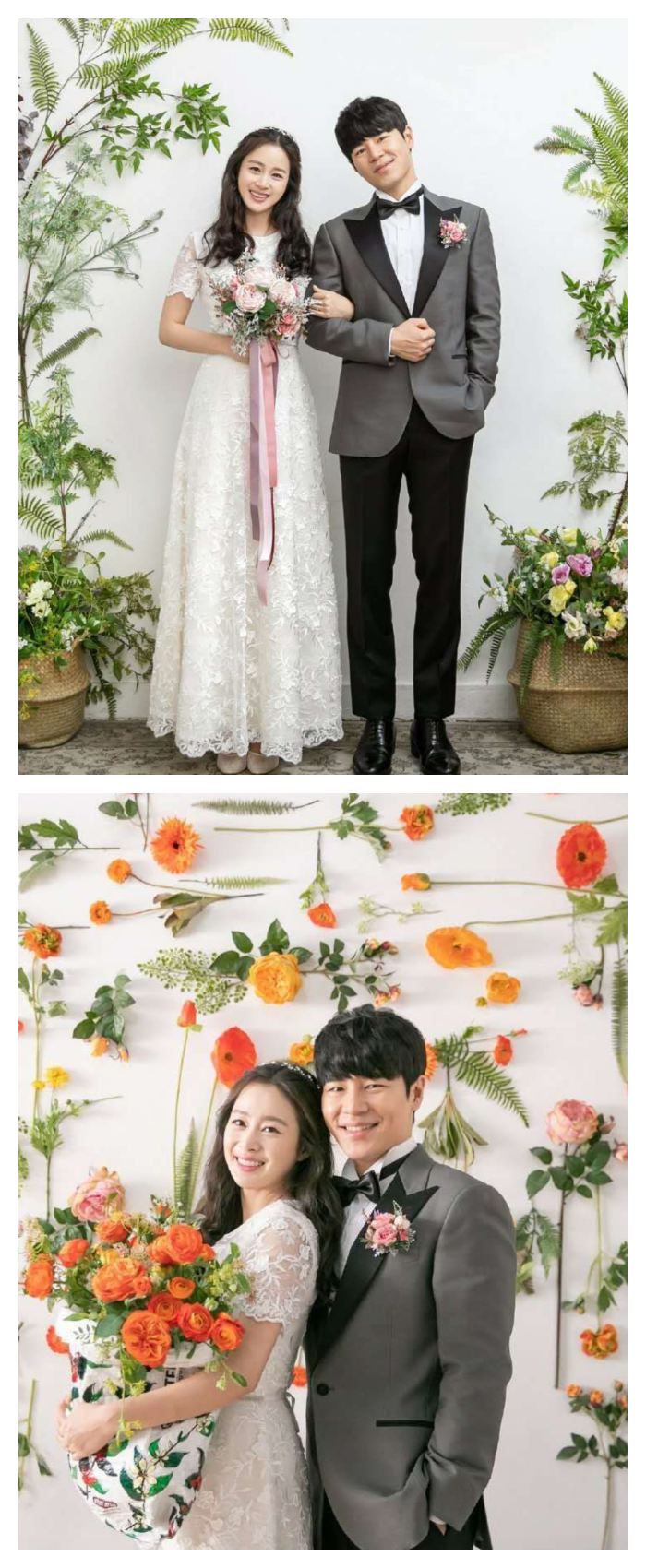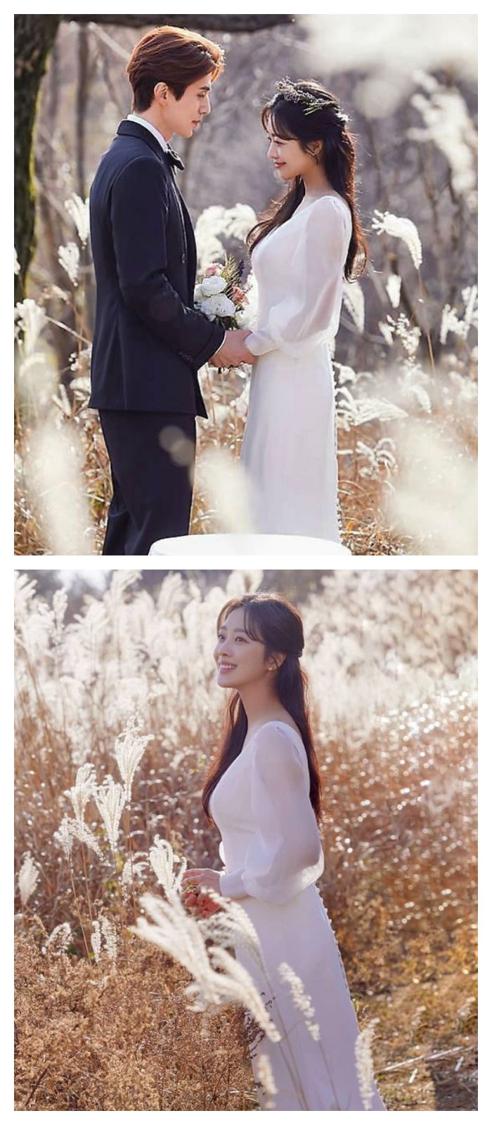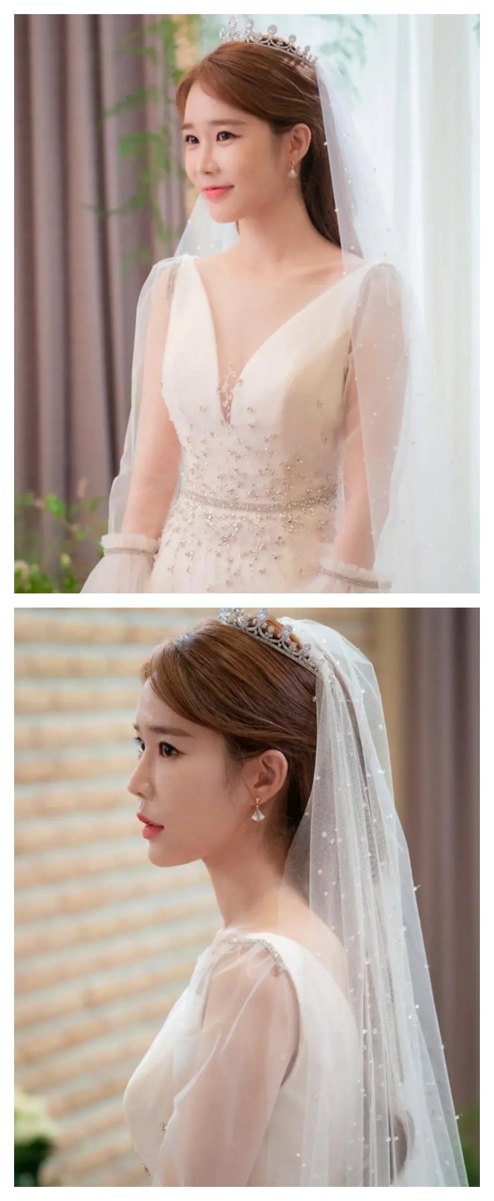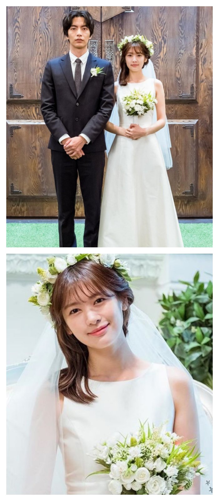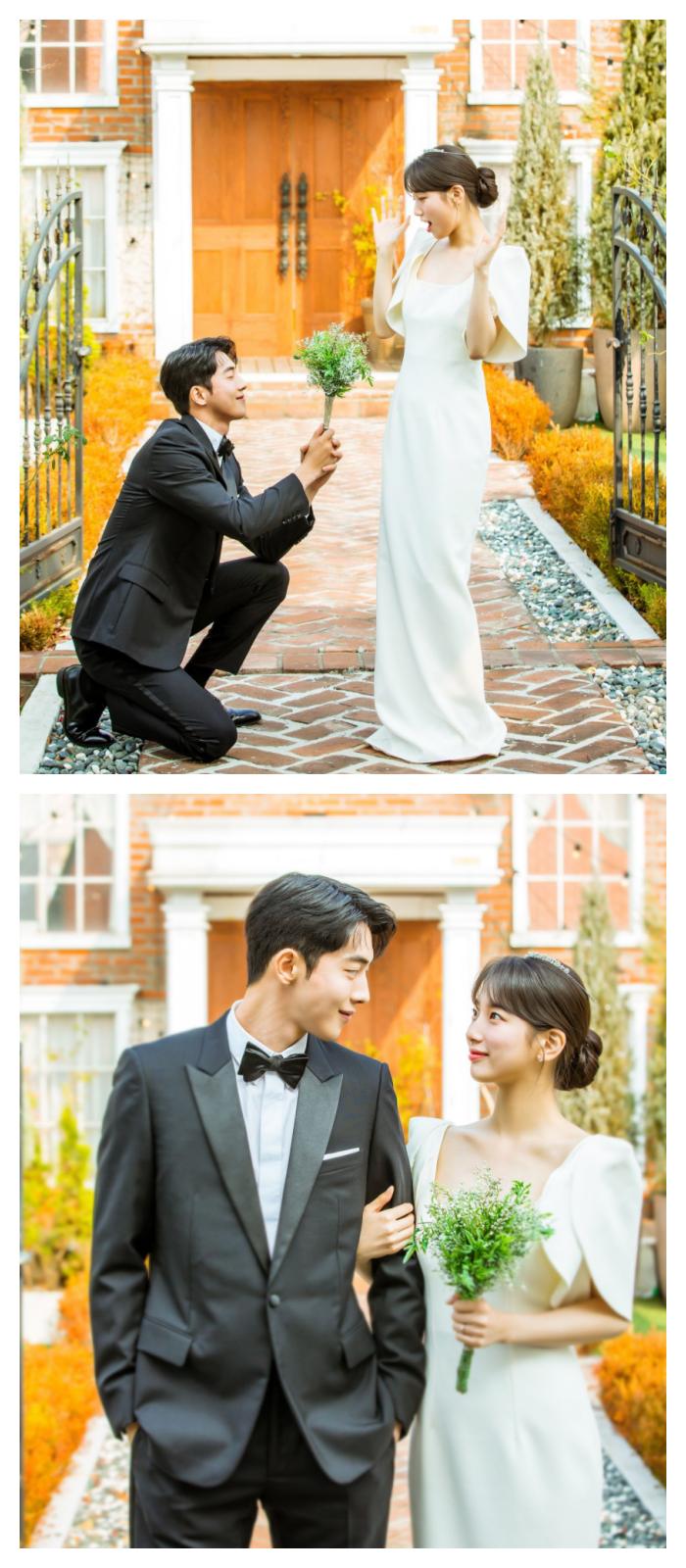 秀智在《Start Up》大结局中虽然没有出现和道山的结婚现场,但是婚照也够甜死人了!她所穿的婚纱简约修身,层次感的蓬袖和复古方领,和秀智剧中的人设相当符合,搭配低发髻和清新的冠冕,完全是喜欢利落感新娘的教科书!