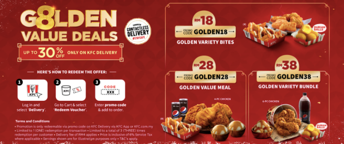 就在刚 KFC 在社交媒体上发布消息,即日起推出全新 Golden Value Deals 超值套餐,而且折扣高达 30% 哦!感兴趣的吃货们,只需要透过 KFC 官网或应用程序点餐,然后使用 Promo Code 就可以享有超值优惠咯!
