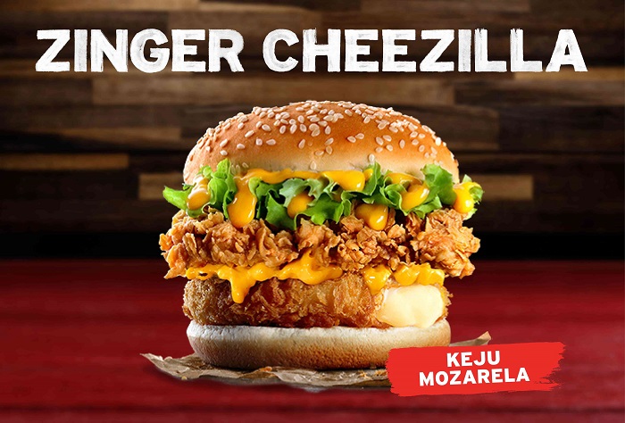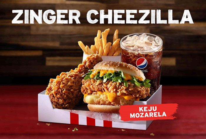 KFC Zinger Cheezilla能以单点、套餐或盒装餐方式享用。好康送上在限时优惠期间,凡通过KFC app订购指定的Zinger Cheezilla 餐点,并选择外卖服务,输入促销代码 ‘CHEEZILLA’,即可独家享有10%折扣。